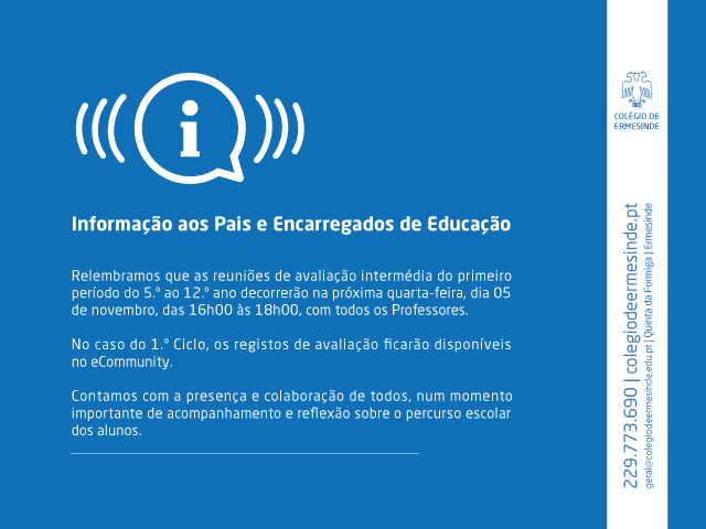 Relembramos que as reuniões de avaliação intermédia do primeiro período do 5.º ao 12.º ano decorrerão na próxima quarta-feira, dia 05 de novembro, das 16h00 às 18h00, com todos os Professores.